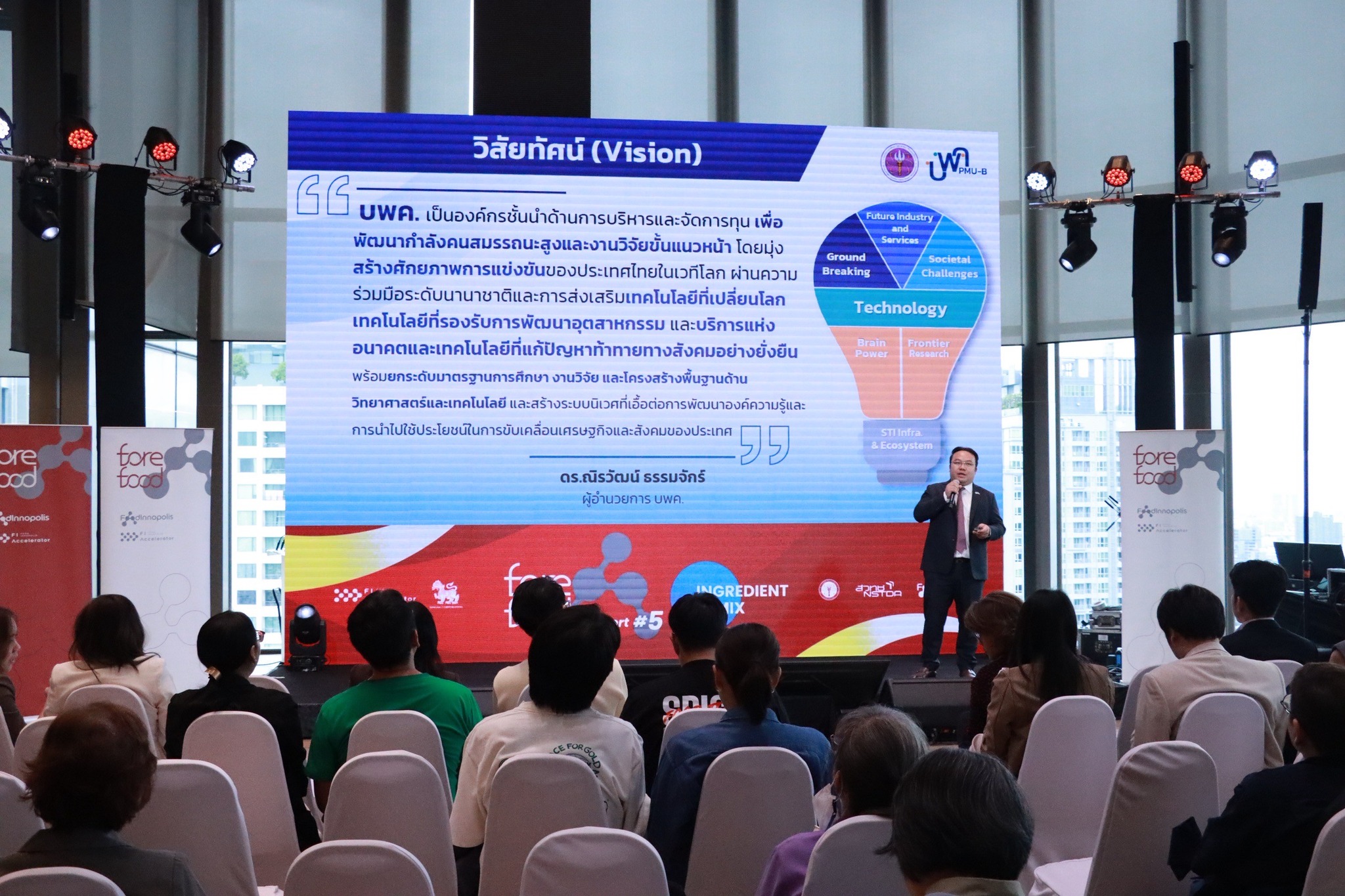 เมื่อวันที่ 23 กันยายน 2568 ดร.ณิรวัฒน์ ธรรมจักร์ ผู้อำนวยการหน่วยบริหารและจัดการทุนด้านการพัฒนากำลังคน และทุนด้านการพัฒนาสถาบันอุดมศึกษา การวิจัยและการสร้างนวัตกรรม (บพค.) กระทรวงการอุดมศึกษา วิทยาศาสตร์ วิจัยและนวัตกรรม (อว.) ร่วมบรรยายพิเศษในหัวข้อ “นโยบายและการสนับสนุนโครงการวิจัย ของ บพค. สู่การนำงานวิจัยไปใช้ประโยชน์“ ภายในงาน FOREFOOD COHORT #5 DEMO DAY ที่จัดโดย เมืองนวัตกรรมอาหาร (Food Innopolis) สำนักงานพัฒนาวิทยาศาสตร์และเทคโนโลยีแห่งชาติ (สวทช.) ร่วมกับ บริษัท บุญรอดบริวเวอรี่ จำกัด ณ อาคาร Singha Complex ชั้น 34 โดยมีนักลงทุน นักธุรกิจ ผู้ประกอบการ นักวิจัย ตลอดจนหน่วยงานภาครัฐและภาคเอกชนที่สนใจกลุ่มธุรกิจนวัตกรรมอาหาร (FoodTech Startup) เข้าร่วมงานอย่างคับคั่ง
