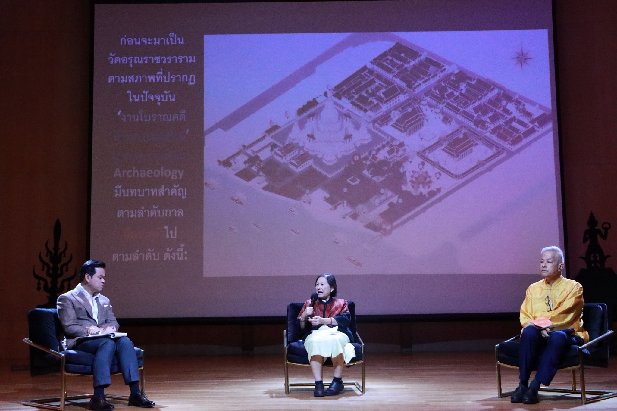 ในช่วงเวทีเสวนา “ถอดรหัสวัดอรุณ” ซึ่งถือเป็นไฮไลต์สำคัญของงาน มีผู้ทรงคุณวุฒิร่วมแลกเปลี่ยนองค์ความรู้ ได้แก่ ดร.อมรา ศรีสุชาติ และอาจารย์เผ่าทอง ทองเจือ ดำเนินรายการโดย ดร.วิทย์ สิทธิเวคิน โดยได้พาผู้เข้าร่วมงานร่วมเดินทางผ่านเรื่องราวของ วัดอรุณราชวราราม ในหลากหลายมิติ ทั้งด้านประวัติศาสตร์ โบราณคดี ศิลปกรรม และวัฒนธรรมของผู้คนในชุมชนท่าเตียน การเสวนาครั้งนี้ได้ถ่ายทอดความงดงามขององค์ความรู้ที่ซ่อนอยู่ในศิลปกรรมและความเชื่อของไทยอย่างลึกซึ้ง และเปิดมุมมองใหม่ให้เห็นว่า วัดอรุณฯ ไม่ใช่เพียงวัดแห่งรุ่งอรุณ หากแต่เป็น “แสงแห่งปัญญา” ที่ปลุกให้เรามองเห็นความเชื่อมโยงระหว่างอดีต ปัจจุบัน และอนาคตของความเป็นไทย แสงแห่งอรุณนี้เปรียบเสมือนพลังแห่งภูมิปัญญาที่หลอมรวมกันเป็นศิลปกรรมอันงดงาม สะท้อนความรุ่งเรืองทางอารยธรรมของชาติที่ยังคงสืบทอดมาจนถึงปัจจุบัน