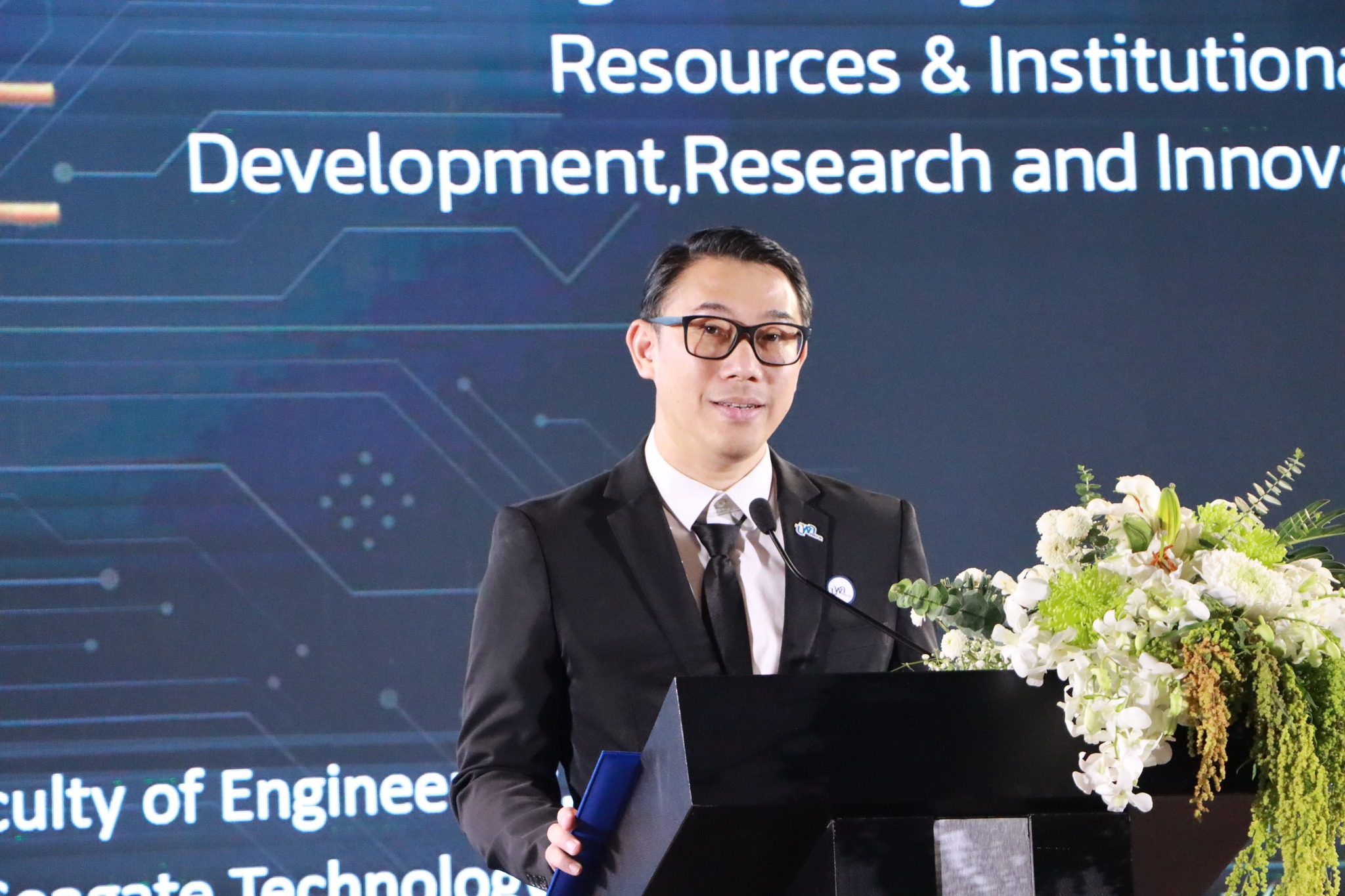 การจัดงานในครั้งนี้เกิดจากความร่วมมือระหว่าง คณะวิศวกรรมศาสตร์ สถาบันเทคโนโลยีพระจอมเกล้าเจ้าคุณทหารลาดกระบัง (สจล.) มหาวิทยาลัยเทคโนโลยีสุรนารี (มทส.) สถาบันวิจัยแสงซินโครตรอน (สซ.) และบริษัท ซีเกท เทคโนโลยี (ประเทศไทย) จำกัด ซึ่งได้รับการสนับสนุนทุนจาก บพค. ภายใต้กองทุนส่งเสริมวิทยาศาสตร์ วิจัยและนวัตกรรม (ววน.) ผ่านแผนงานเป้าหมายสำคัญตามยุทธศาสตร์วิทยาศาสตร์ วิจัยและนวัตกรรมประเด็น “ประเทศไทยเกิดงานใหม่ ทักษะสูง รายได้ดี ใน 3 อุตสาหกรรม (Semiconductor, EV และ AI)” ประจำปีงบประมาณ 2568 โดยได้รับเกียรติจาก ศาสตราจารย์ ดร.สุรินทร์ คำฝอย รองผู้อำนวยการสำนักงานสภานโยบายการอุดมศึกษา วิทยาศาสตร์ วิจัยและนวัตกรรมแห่งชาติ (สอวช.) คุณศุธาศินี สมิตร รองเลขาธิการ สำนักงานคณะกรรมการส่งเสริมการลงทุน รองศาสตราจารย์ ดร.สมยศ เกียรติวนิชวิไล คณบดีคณะวิศวกรรมศาสตร์ สจล. คุณนรเชษฐ์ แซ่ตั้ง Thailand Country Manager และ รองประธานฝ่ายปฏิบัติการ บริษัท ซีเกท เทคโนโลยี (ประเทศไทย) จำกัด ร่วมกล่าวเปิดงาน และกล่าวต้อนรับคณะผู้บริหาร คณาจารย์ และนักวิจัย กว่า 200 คน