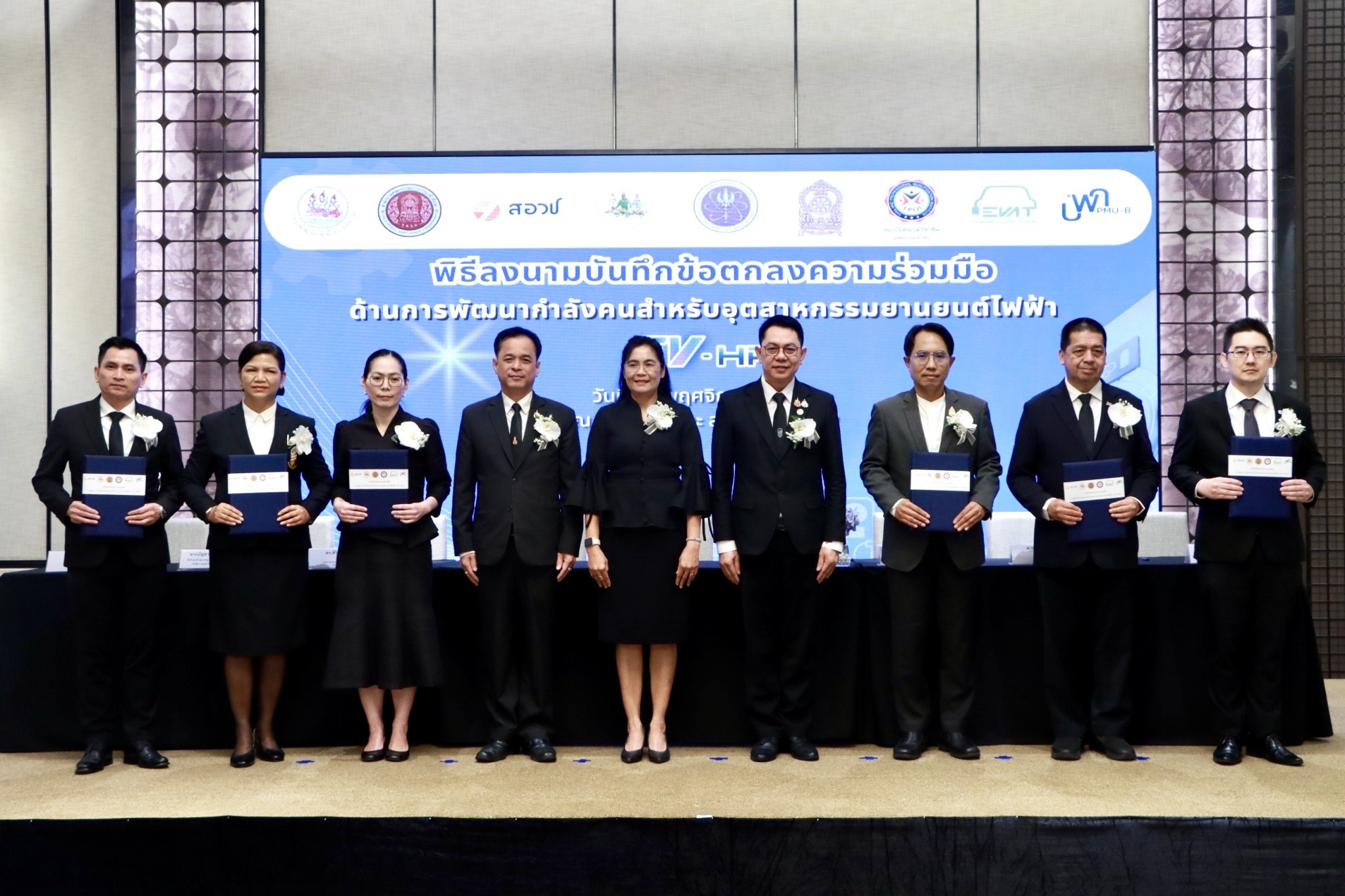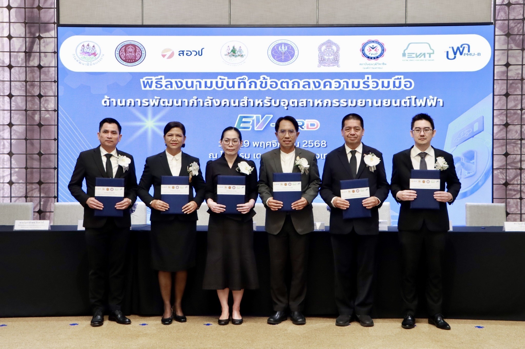เมื่อวันที่ 19 พฤศจิกายน 2568 กระทรวงการอุดมศึกษา วิทยาศาสตร์ วิจัยและนวัตกรรม (อว.) โดยสำนักงานสภานโยบายการอุดมศึกษา วิทยาศาสตร์ วิจัยและนวัตกรรมแห่งชาติ (สอวช.) ร่วมกับ หน่วยบริหารและจัดการทุนด้านการพัฒนากำลังคน และทุนด้านการพัฒนาสถาบันอุดมศึกษา การวิจัยและการสร้างนวัตกรรม (บพค.) และอีก 4 หน่วยงานเครือข่าย ได้แก่ กรมพัฒนาฝีมือแรงงาน (กพร.) สำนักงานคณะกรรมการการอาชีวศึกษา (สอศ.) สถาบันคุณวุฒิวิชาชีพ (องค์กรมหาชน) (สคช.) และสมาคมยานยนต์ไฟฟ้าไทย (EVAT) จัดพิธีลงนามบันทึกข้อตกลงความร่วมมือ (MOU) ด้านการพัฒนากำลังคนสำหรับอุตสาหกรรมยานยนต์ไฟฟ้า (EV–HRD) ณ ห้องกมลทิพย์บอลรูม 2 โรงแรมเดอะ สุโกศล กรุงเทพมหานคร โดยมีผู้เข้าร่วมจากภาครัฐ ภาคการศึกษา และภาคเอกชน กว่า 100 คน
