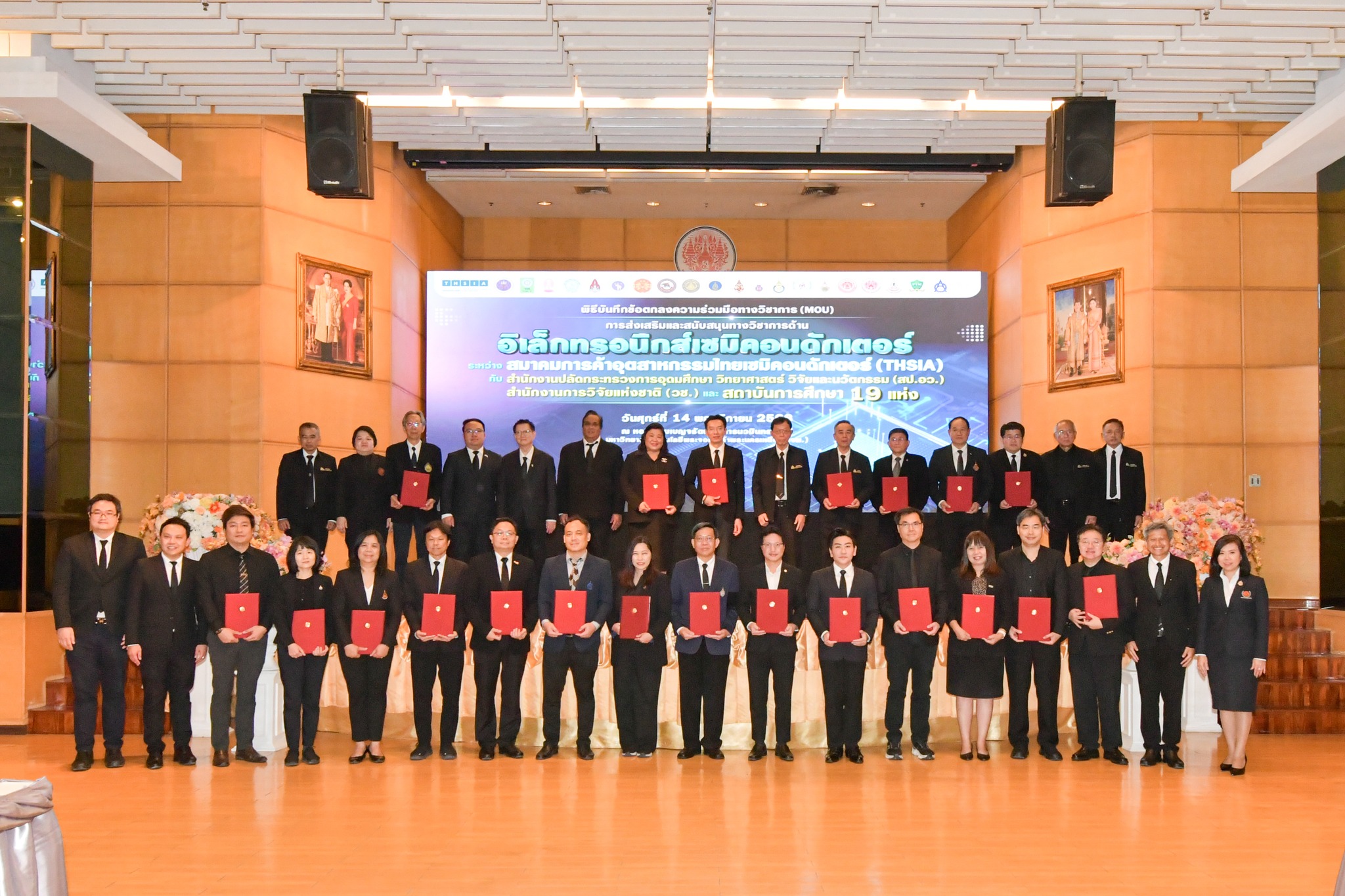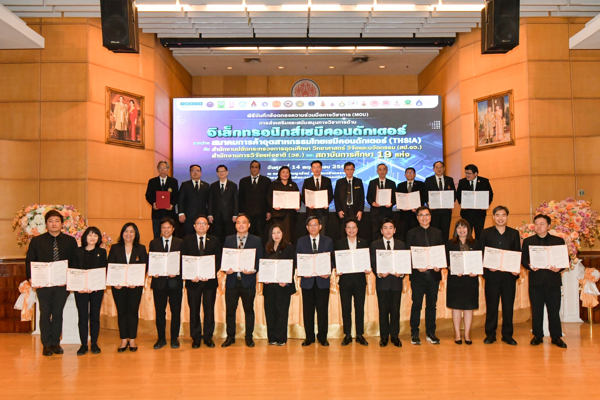 เมื่อวันที่ 14 พฤศจิกายน 2568 หน่วยบริหารและจัดการทุนด้านการพัฒนากำลังคน และทุนด้านการพัฒนาสถาบันอุดมศึกษา การวิจัยและการสร้างนวัตกรรม (บพค.) กระทรวงการอุดมศึกษา วิทยาศาสตร์ วิจัยและนวัตกรรม (อว.) โดย ดร.ณิรวัฒน์ ธรรมจักร์ ผู้อำนวยการ บพค. เข้าร่วมเป็นสักขีพยานพิธีลงนามบันทึกข้อตกลงความร่วมมือทางวิชาการ (MOU) ระหว่าง สำนักงานปลัดกระทรวงการอุดมศึกษา วิทยาศาสตร์ วิจัยและนวัตกรรม สมาคมการค้าอุตสาหกรรมไทยเซมิคอนดักเตอร์ (Thai Semiconductor Industry Trade Association: THSIA) สำนักงานการวิจัยแห่งชาติ (วช.) และ 19 มหาวิทยาลัยเครือข่ายทั่วประเทศ ณ หอประชุมเบญจรัตน์ อาคารนวมินทรราชินี มหาวิทยาลัยเทคโนโลยีพระจอมเกล้าพระนครเหนือ (มจพ.)
