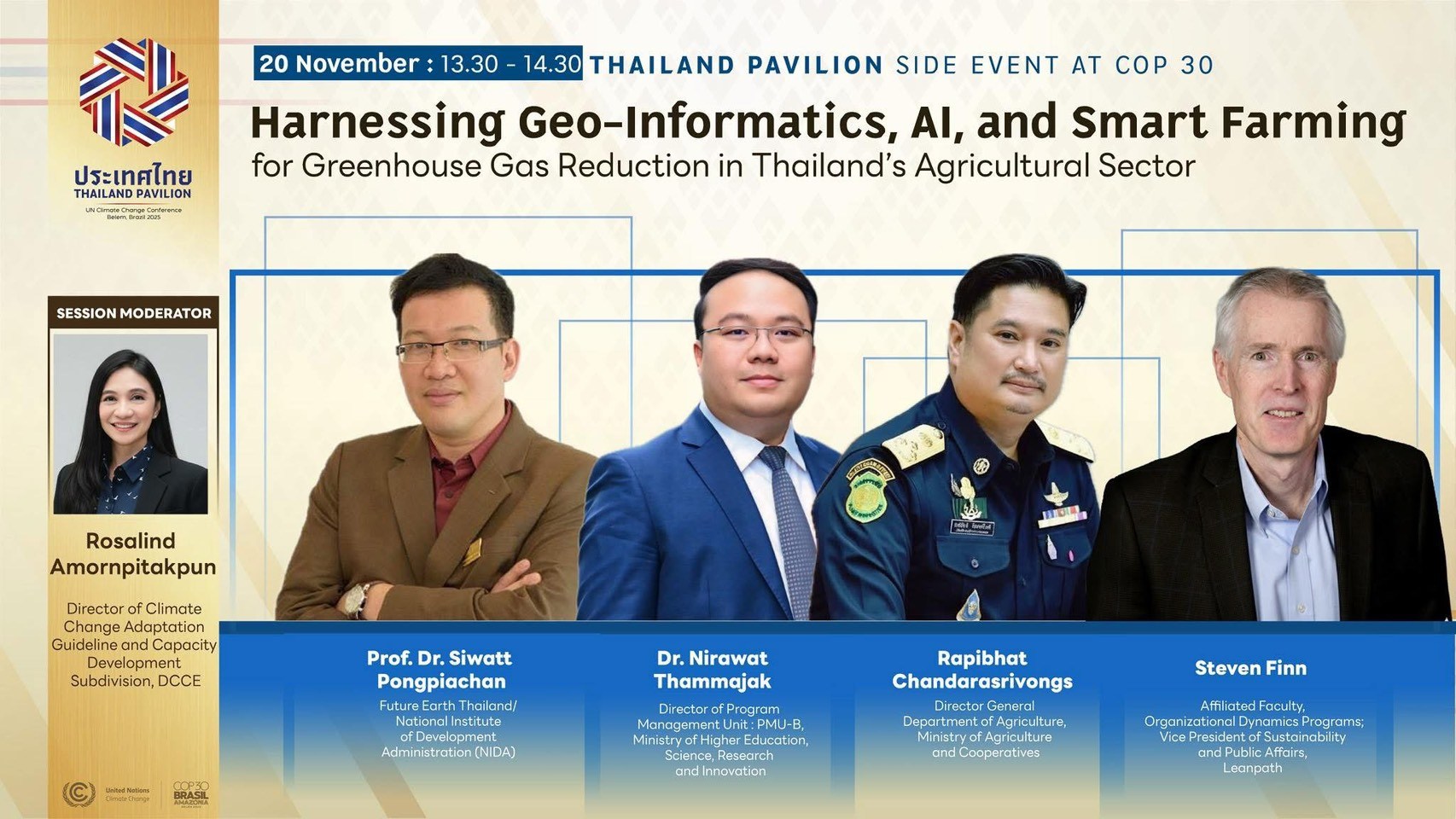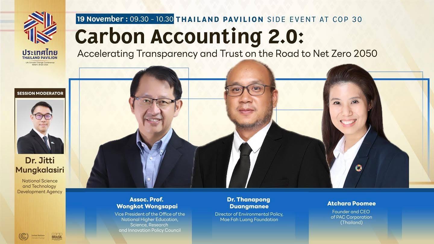 เมื่อวันที่ 18-20 พฤศจิกายน 2568 ดร.ณิรวัฒน์ ธรรมจักร์ ผู้อำนวยการหน่วยบริหารและจัดการทุนด้านการพัฒนากำลังคน และทุนด้านการพัฒนาสถาบันอุดมศึกษา การวิจัยและการสร้างนวัตกรรม (บพค.) กระทรวงการอุดมศึกษา วิทยาศาสตร์ วิจัยและนวัตกรรม (อว.) เดินทางเข้าร่วมการประชุมรัฐภาคีกรอบอนุสัญญาสหประชาชาติ ว่าด้วยการเปลี่ยนแปลงสภาพภูมิอากาศ สมัยที่ 30 (the 30th Conference of the Parties to the UNFCCC – COP 30) พร้อมมอบหมาย ดร.จิตติ มังคละศิริ รองผู้อำนวยการ บพค. เข้าร่วมกิจกรรมคู่ขนาน (Side Event) เรื่อง “Harnessing Geoinformatics, AI and Smart farming for GHG reduction in Thailand’s Agricultural sector” ซึ่งมีกำหนดจัดงานระหว่างวันที่ 10-21 พฤศจิกายน 2568 ณ Hangar – Convention and Trade Center of the Amazon เมืองเบเล็ง (Belém) สหพันธรัฐบราซิล