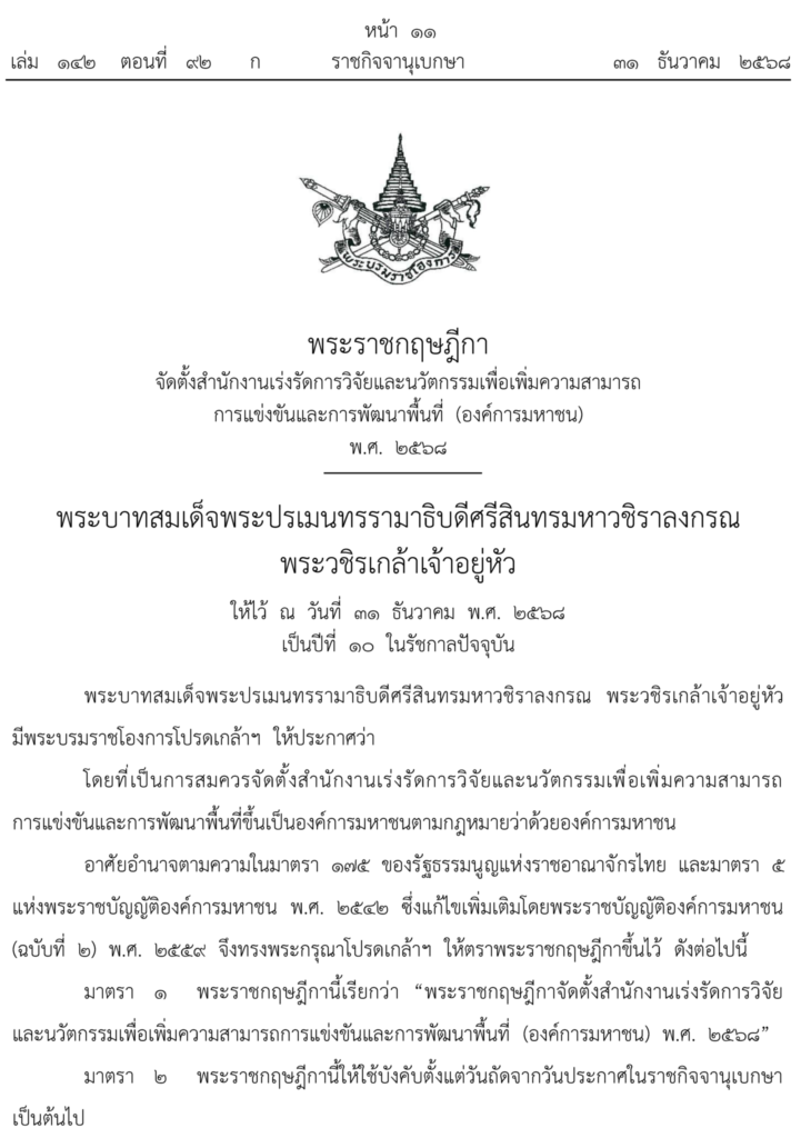 “รวพ. เป็นหน่วยงานของรัฐประเภทองค์การมหาชน ภายใต้กระทรวง อว. ถูกออกแบบให้มีรูปแบบการบริหารและจัดการแบบใหม่ รองรับการเปลี่ยนแปลงของเทคโนโลยีและอุตสาหกรรมในอนาคต และปิดช่องว่างการดำเนินงานในระบบ วิทยาศาสตร์ วิจัยและนวัตกรรม (ววน.) เพื่อสร้างศักยภาพให้แก่ภาคเอกชนและภาคประชาสังคมโดยมีหน้าที่และบทบาทในการบริหารจัดการและให้ทุนวิจัยและนวัตกรรม ขับเคลื่อนและเร่งรัดการพัฒนาเทคโนโลยีและนวัตกรรมเพื่อนำไปสู่การใช้ประโยชน์โดยการมีส่วนร่วมของผู้ใช้ประโยชน์และก่อให้เกิดการเปลี่ยนแปลงที่เป็นรูปธรรม”