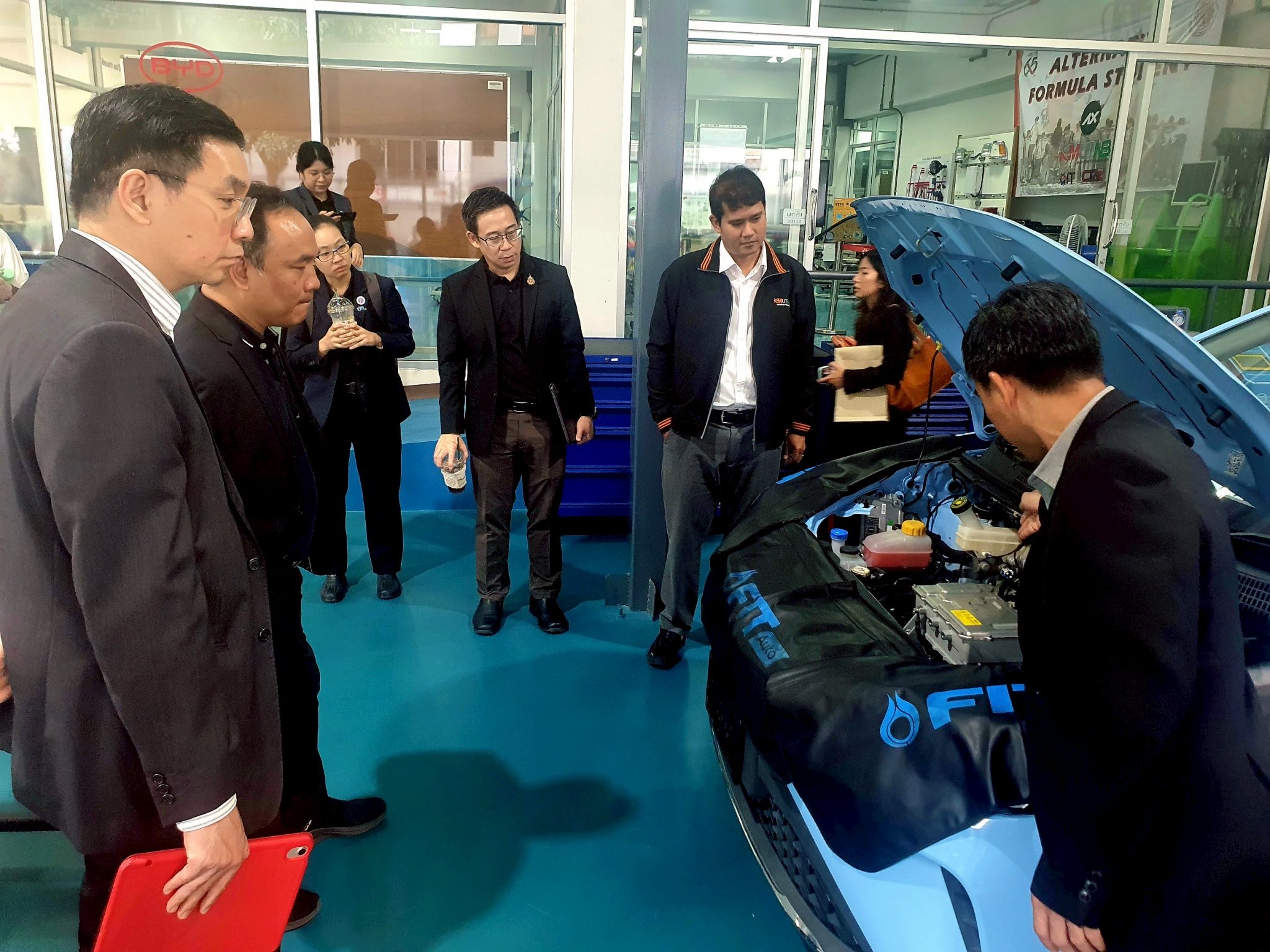 ต่อมา คณะฯ ได้เดินทางไปยังมหาวิทยาลัยเทคโนโลยีพระจอมเกล้าพระนครเหนือ เพื่อติดตามผลการดำเนินงานโครงการพัฒนากำลังคนสมรรถนะสูงด้านการตรวจสอบและการบำรุงรักษาแบตเตอรี่สำหรับยานยนต์ไฟฟ้าตามมาตรฐานด้านความปลอดภัยสำหรับระบบไฟฟ้าแรงสูงในยานยนต์ไฟฟ้า ตามความต้องการของอุตสาหกรรมยานยนต์ไฟฟ้า ซึ่งดำเนินการร่วมกับบริษัท ปตท. น้ำมันและการค้าปลีก จำกัด (มหาชน) (PTTOR) โดยมี ผศ.ดร.ชัยยุทธ์ สัมภวะคุปต์ หัวหน้าโครงการ เป็นผู้บรรยายสรุปความคืบหน้าการดำเนินงาน พร้อมกับผู้แทนของบริษัทฯ โดยโครงการฯ ได้จัดอบรมพัฒนาทักษะ (Upskill/Reskill) ให้แก่พนักงานในเครือ FIT Auto แล้วกว่า 150 คน