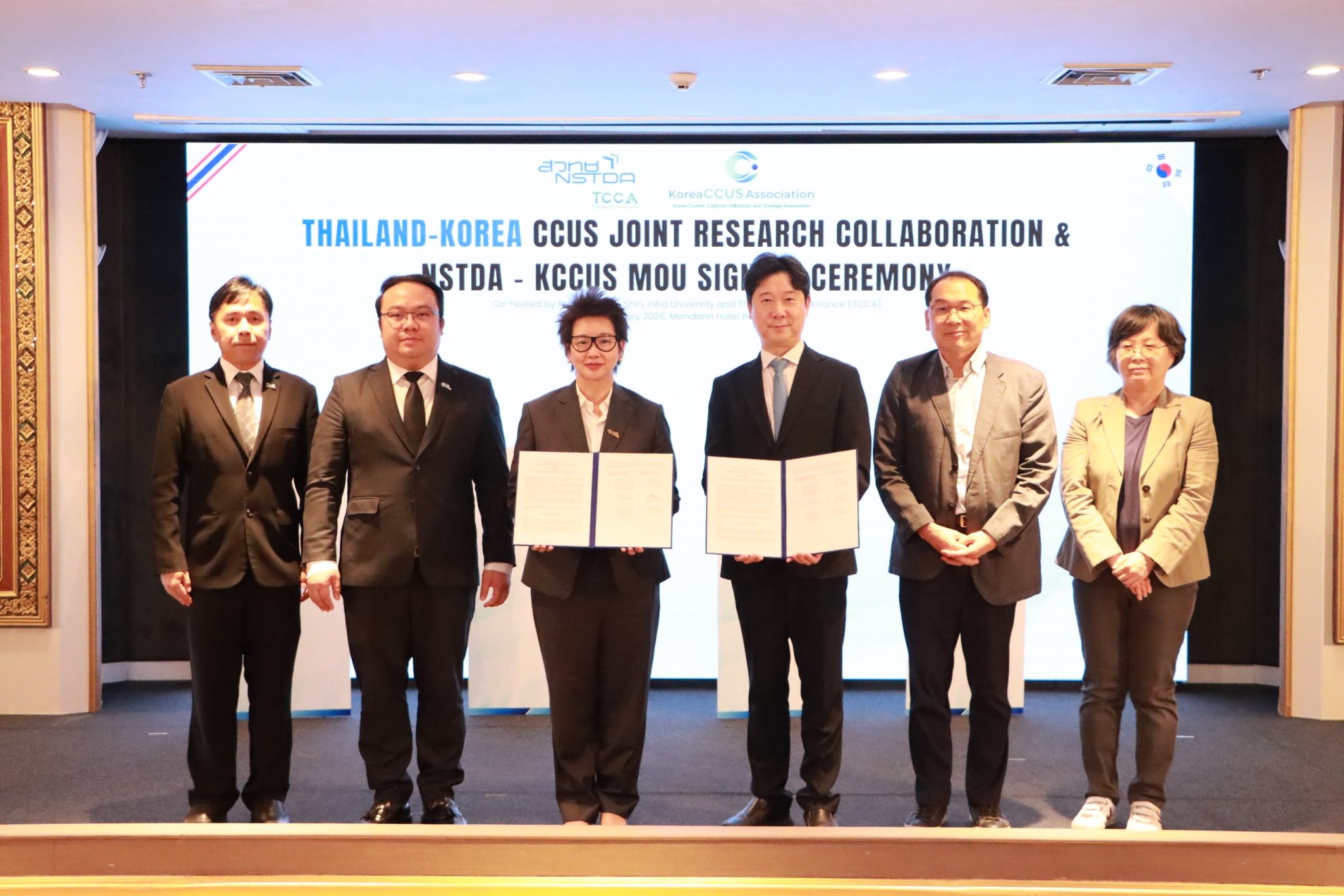 เมื่อวันที่ 9 กุมภาพันธ์ 2569 หน่วยบริหารจัดการทุนด้านเทคโนโลยีและนวัตกรรมเพื่ออุตสาหกรรมแห่งอนาคต (บพค.) ภายใต้สำนักงานเร่งรัดการวิจัยและนวัตกรรมเพื่อเพิ่มความสามารถการแข่งขันและการพัฒนาพื้นที่ (องค์การมหาชน) (รวพ.) กระทรวงการอุดมศึกษา วิทยาศาสตร์ วิจัยและนวัตกรรม (อว.) นำโดย ดร.ณิรวัฒน์ ธรรมจักร์ ปฏิบัติหน้าที่ผู้อำนวยการหน่วยฯ พร้อมด้วย ดร.จิตติ มังคละศิริ ปฏิบัติหน้าที่รองผู้อำนวยการหน่วยฯ ร่วมเป็นสักขีพยานในพิธีลงนามบันทึกข้อตกลงความร่วมมือ (MOU) ภาคีเครือข่ายพันธมิตรด้านการดักจับ ใช้ประโยชน์ และกักเก็บคาร์บอนแห่งประเทศไทย (Thailand CCUS Alliance: TCCA) โดยลงนามร่วมกับสมาคมการดักจับ ใช้ประโยชน์ และกักเก็บคาร์บอนแห่งเกาหลี (Korea CCUS Association: KCCUS) ณ ห้องประชุมบุษบา โรงแรมแมนดาริน สามย่าน กรุงเทพฯ เพื่อส่งเสริมความร่วมมือระหว่างประเทศในการแลกเปลี่ยนองค์ความรู้ นโยบายและกฎระเบียบด้านเทคโนโลยี CCUS ให้สอดคล้องและเป็นไปตามเป้าหมายความเป็นกลางทางคาร์บอน Carbon Neutrality และ Net Zero ภายในปี 2050 นำไปสู่การเสริมสร้างการพัฒนาอุตสาหกรรมและพลังงานสะอาดในอนาคต พร้อมทั้งยกระดับศักยภาพเทคโนโลยี CCUS ของประเทศไทยสู่มาตรฐานสากล