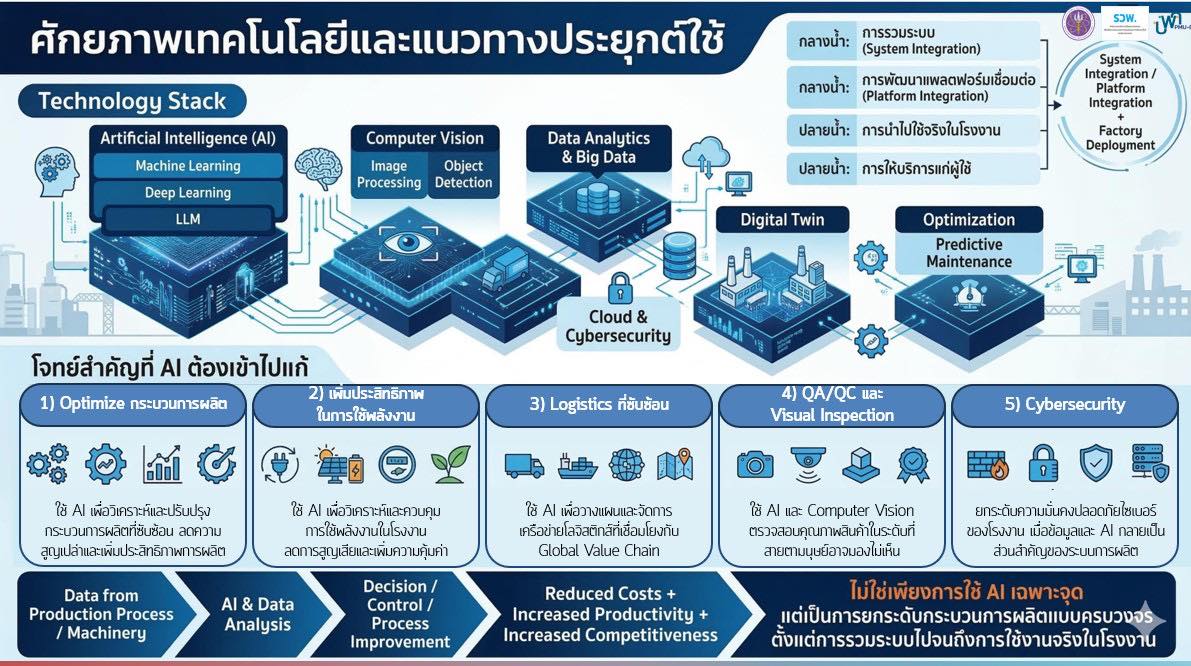 บพค. ในฐานะหน่วยบริหารจัดการทุนที่มีเป้าหมายเพื่อการสร้างโอกาสและรากฐานไปสู่อุตสาหกรรมและกิจการแห่งอนาคต จึงได้พัฒนาแผนงาน “ยกระดับผู้ประกอบการอุตสาหกรรมผ่านการประยุกต์ใช้ AI ในภาคการผลิต” เพื่อเป็นกลไกสำคัญในการขับเคลื่อนนโยบายดังกล่าวไปสู่การปฏิบัติจริงในภาคอุตสาหกรรม โดยเน้นการเพิ่มประสิทธิภาพการใช้พลังงานครอบคลุมใน 3 มิติสำคัญ ได้แก่ การปรับปรุงกระบวนการผลิตให้ใช้พลังงานอย่างมีประสิทธิภาพ (Process Optimization) การบำรุงรักษาเชิงคาดการณ์เพื่อลดการสูญเสียพลังงานและเพิ่มความต่อเนื่องของการผลิต (Predictive Maintenance) และการบริหารจัดการพลังงานในระบบการผลิต รวมถึงการนำพลังงานความร้อนกลับมาใช้ใหม่ (Energy Optimization & Waste Heat Recovery)